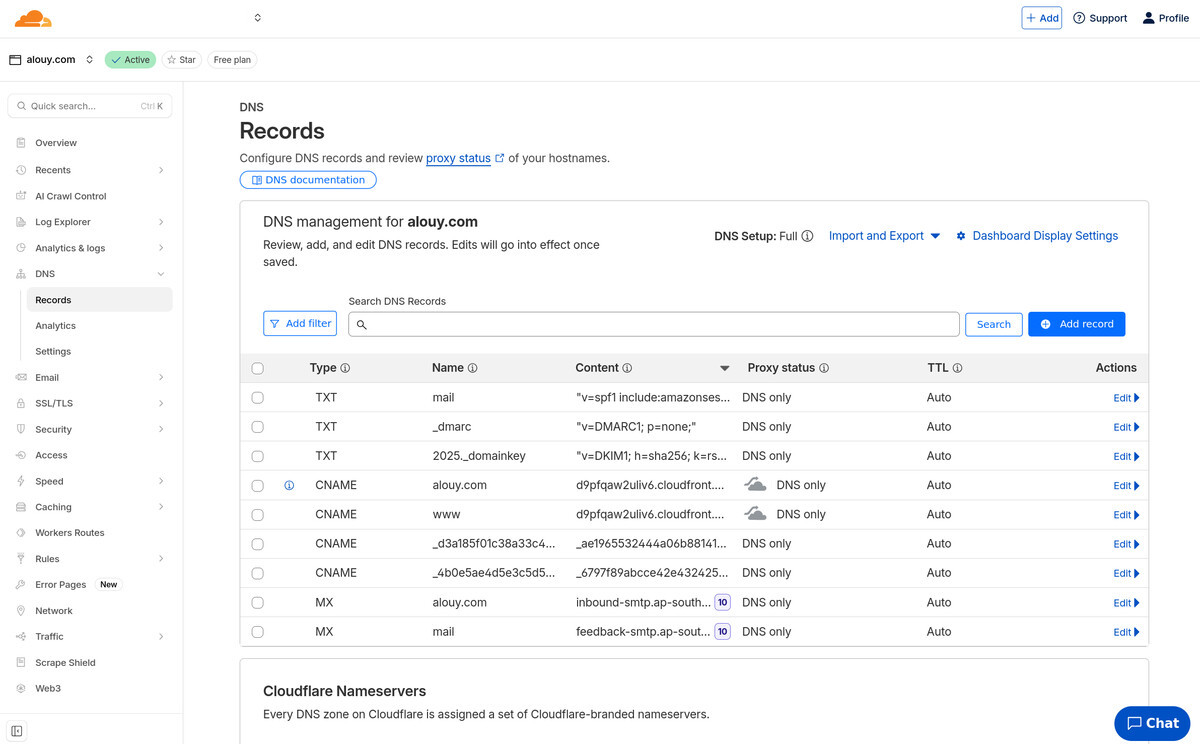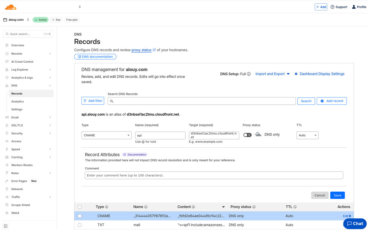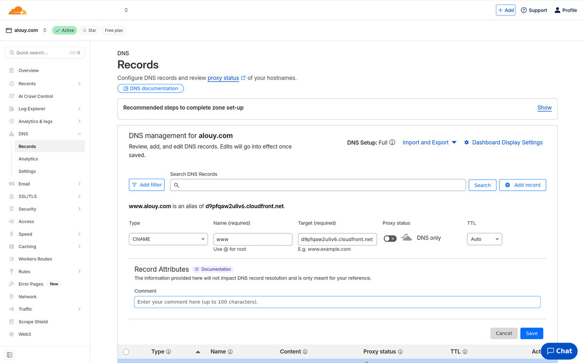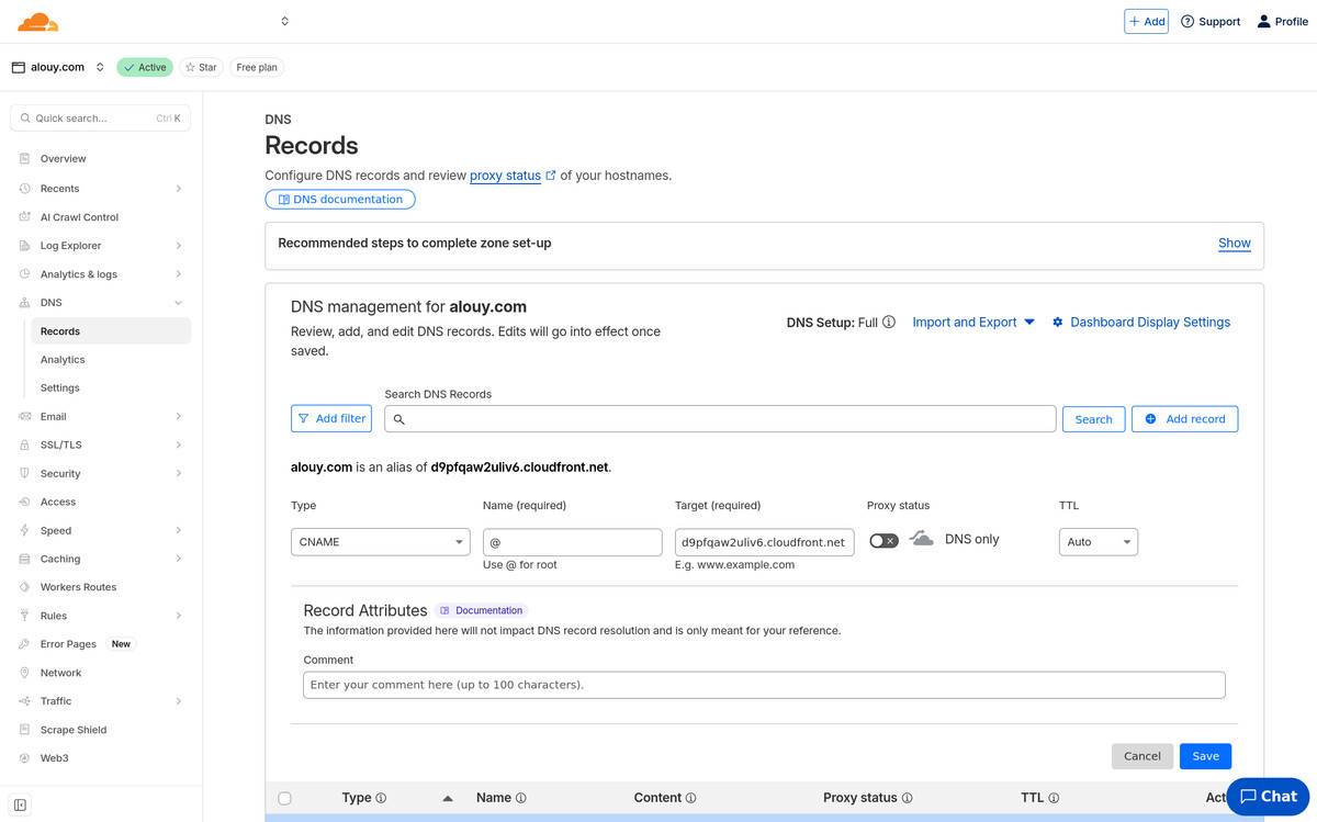 After you run this it'll output a field named "url_static" at the bottom. Now lets add two DNS records that point to that domain name.cloudfront.tf