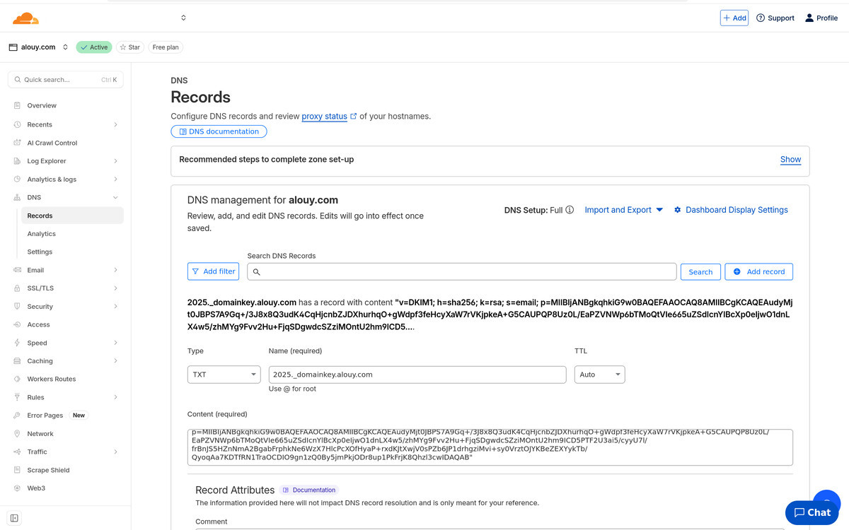 2025._domainkey IN TXT ( "v=DKIM1; h=sha256; k=rsa; s=email; " "p=MIIBIjANBgkqhkiG9w0BAQEFAAOCAQ8AMIIBCgKCAQEAudyMjt0JBPS7A9Gq+/3J8x8Q3udK4CqHjcnbZJDXhurhqO+gWdpf3feHcyXaW7rVKjpkeA+G5CAUPQP8Uz0L/EaPZVNWp6bTMoQtVIe665uZSdIcnYlBcXp0eIjwO1dnLX4w5/zhMYg9Fvv2Hu+FjqSDgwdcSZziMOntU2hm9ICD5PTF2U3ai5/cyyU7l/frBnJS5HZnNmA2Bg" "abFrphkNe6WzX7HlcPcXOfHyaP+rxdKJtXwjV0sPZb6JP1drhgziMvi+sy0VrztOJYKBeZEXYykTb/QyoqAa7KDTfRN1TraOCDIO9gn1zQ0By5jmPkjODr8up1PkFrjK8Qhzl3cwIDAQAB" ) ; ----- DKIM key 2025 for alouy.comNote how it is all one line now, and the double-quotes that broke up the lines have been removed.2025.txt (transformed)