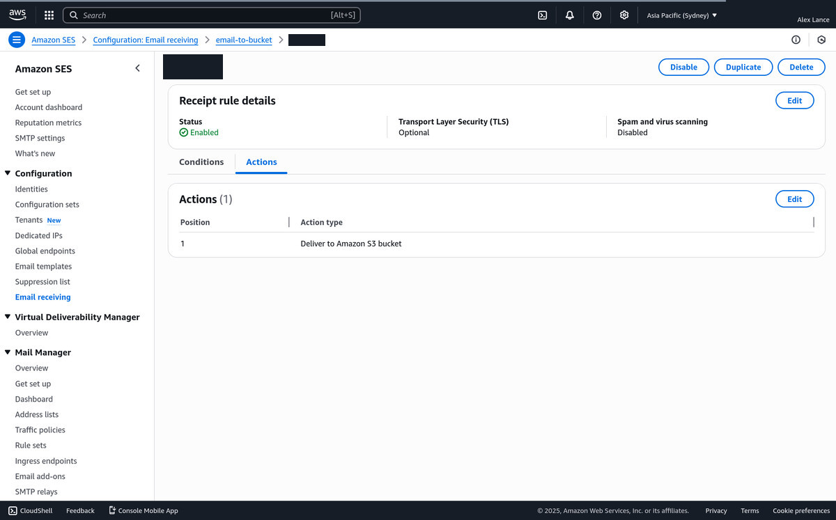 - Go to AWS SES Email Receiving